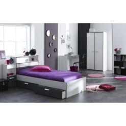 Lit Bois Pin Blanc Et Bois Gris Graphite 90×200 Cm Avec 1 Chevet Et 2 Tiroirs De Rangement Lydia