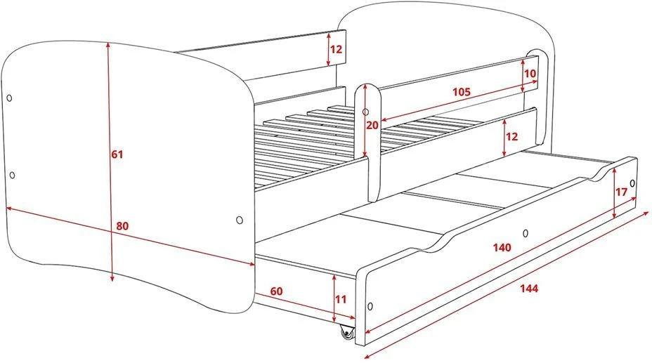 140x70cm – L 144 x P 80 x H 61 cm