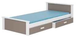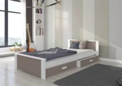 Fabriqué avec soin en bois de pin vernis blanc mat et bois taupe robuste et esthétique.nous utilisons des vernis écologiques, peints au pistolet, pour protéger le lit. Grâce à trois couches de vernis appliquées avec précision, notre lit garantit une résistance exceptionnelle aux dommages mécaniques et à divers types de salissures.