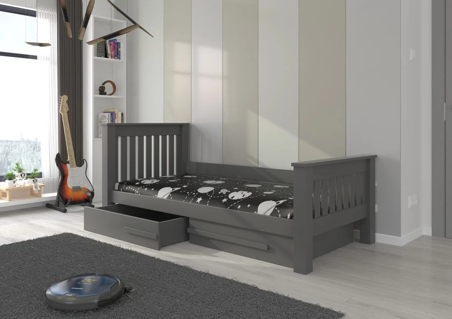 Fabriqué avec soin en bois de pin vernis mat gris graphite robuste et esthétique.nous utilisons des vernis écologiques, peints au pistolet, pour protéger le lit. Grâce à trois couches de vernis appliquées avec précision, notre lit garantit une résistance exceptionnelle aux dommages mécaniques et à divers types de salissures.