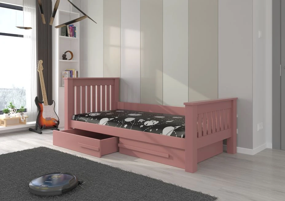 Fabriqué avec soin en bois de pin vernis mat rose robuste et esthétique.nous utilisons des vernis écologiques, peints au pistolet, pour protéger le lit. Grâce à trois couches de vernis appliquées avec précision, notre lit garantit une résistance exceptionnelle aux dommages mécaniques et à divers types de salissures.