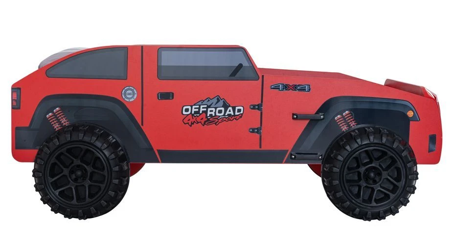 Structure en bois et plastique brillant rouge ABS (le mĂŞme que celui des Legos).