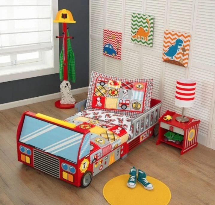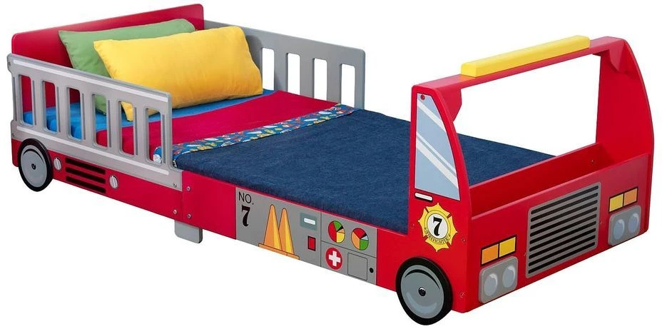 Au niveau des pieds, le lit a la forme d’une cabine de camion dotĂ©e d’un compartiment de rangement pour des livres, doudous et autres objets utiles.