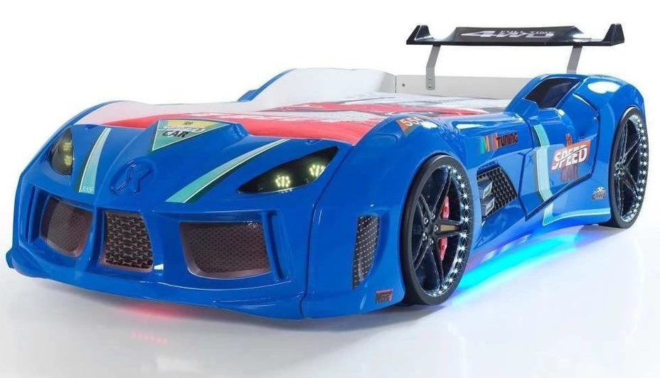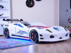 Lit voiture enfant vendu avec notice de montage, sommier, LEDS et boitier d’alimentation.
