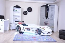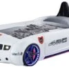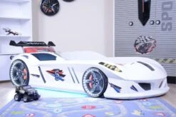 Bien sur comme tout lit voiture enfant celui-ci est doté de phares, tours de roues et bas de caisse éclairés par led : un éclairage magnifique sans dégagement de chaleur, en très basse tension et avec un transformateur externe!