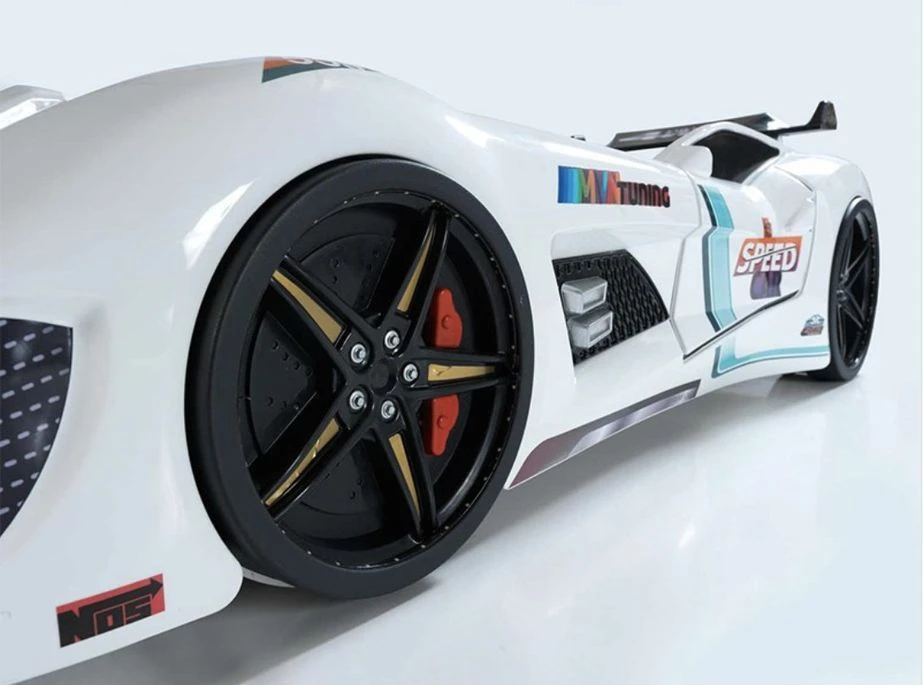 Les 4 roues du lit LED V8 enfant sont munies de rubans LED : pas moins de 17 LEDs par roue : effet garanti !