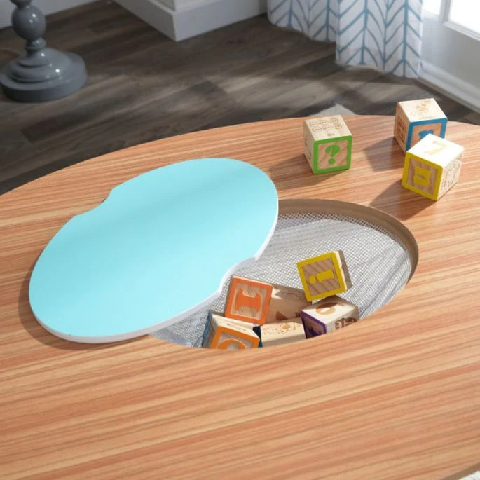 Couvercle réversible au niveau du plateau de table : 1 face bleu clair, 1 face blanche